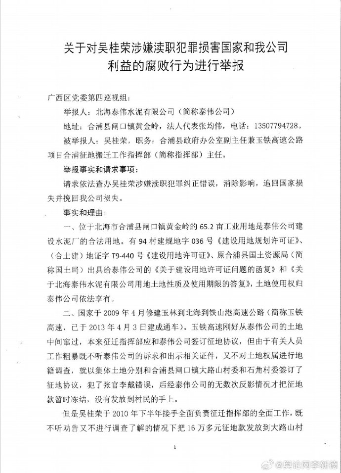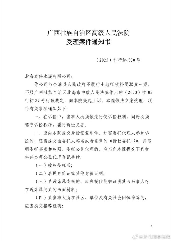 舆论网北海讯 2025年8月7日,北海泰伟水泥有限公司(以下简称“泰伟公司”)向舆论网反映,其位于合浦县闸口镇黄金岭的65.2亩工业用地因玉铁高速公路建设被征收,但16年来未获任何补偿,企业合法权益遭受严重侵害。记者调查发现,该案涉及征地程序争议、补偿款错付及司法执行困境等多重问题。