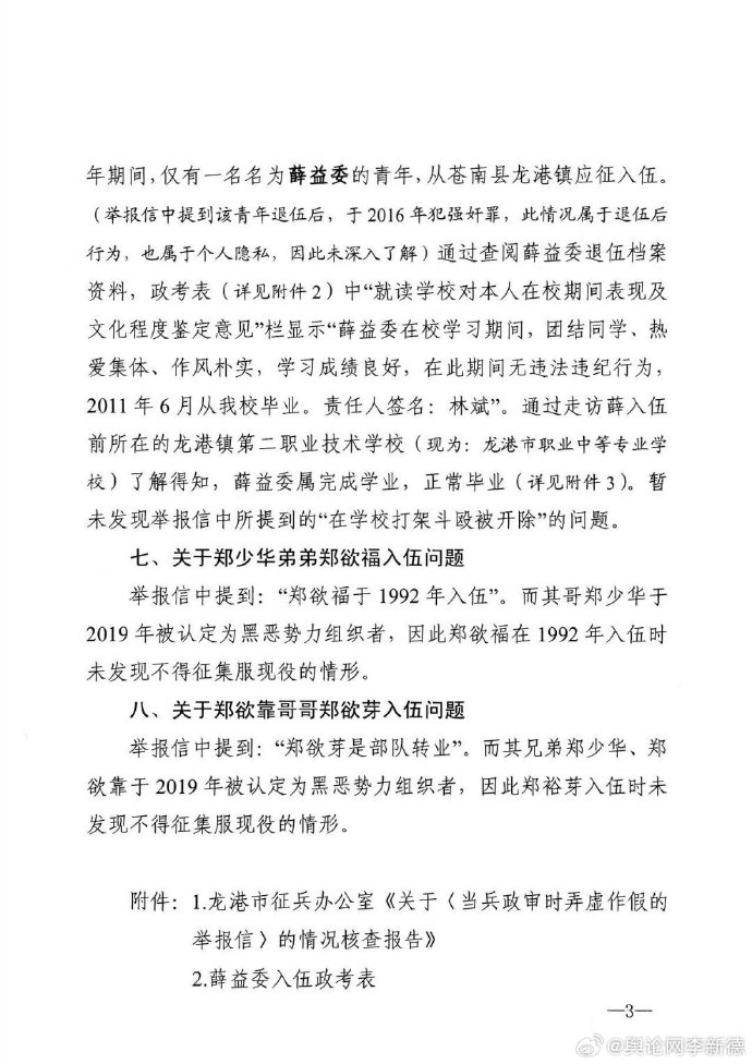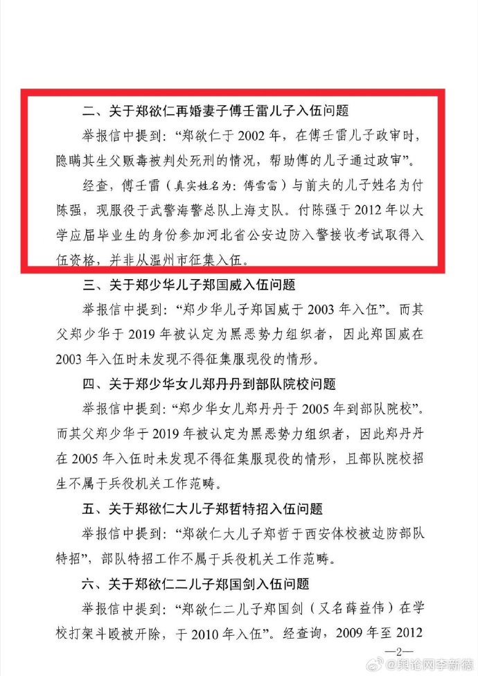 此外,报告还回应了举报信中涉及郑氏家族其他成员的入伍及相关争议,具体情况如下: