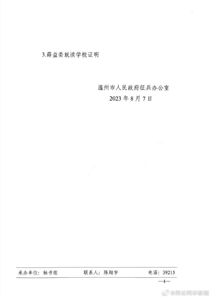 近日,举报人郑裕雪拿着两份温州市、龙港市征兵办转交给他的两份关于“当兵政审弄虚作假”的核查文件告诉舆论网说,其中温州市人民政府征兵办公室出具的温征函〔2023〕11号报告,披露了一起“亲属涉重大犯罪仍通过政审”的典型案例,引发公众对征兵政治审核机制严密性的质疑。